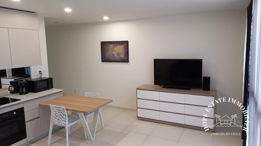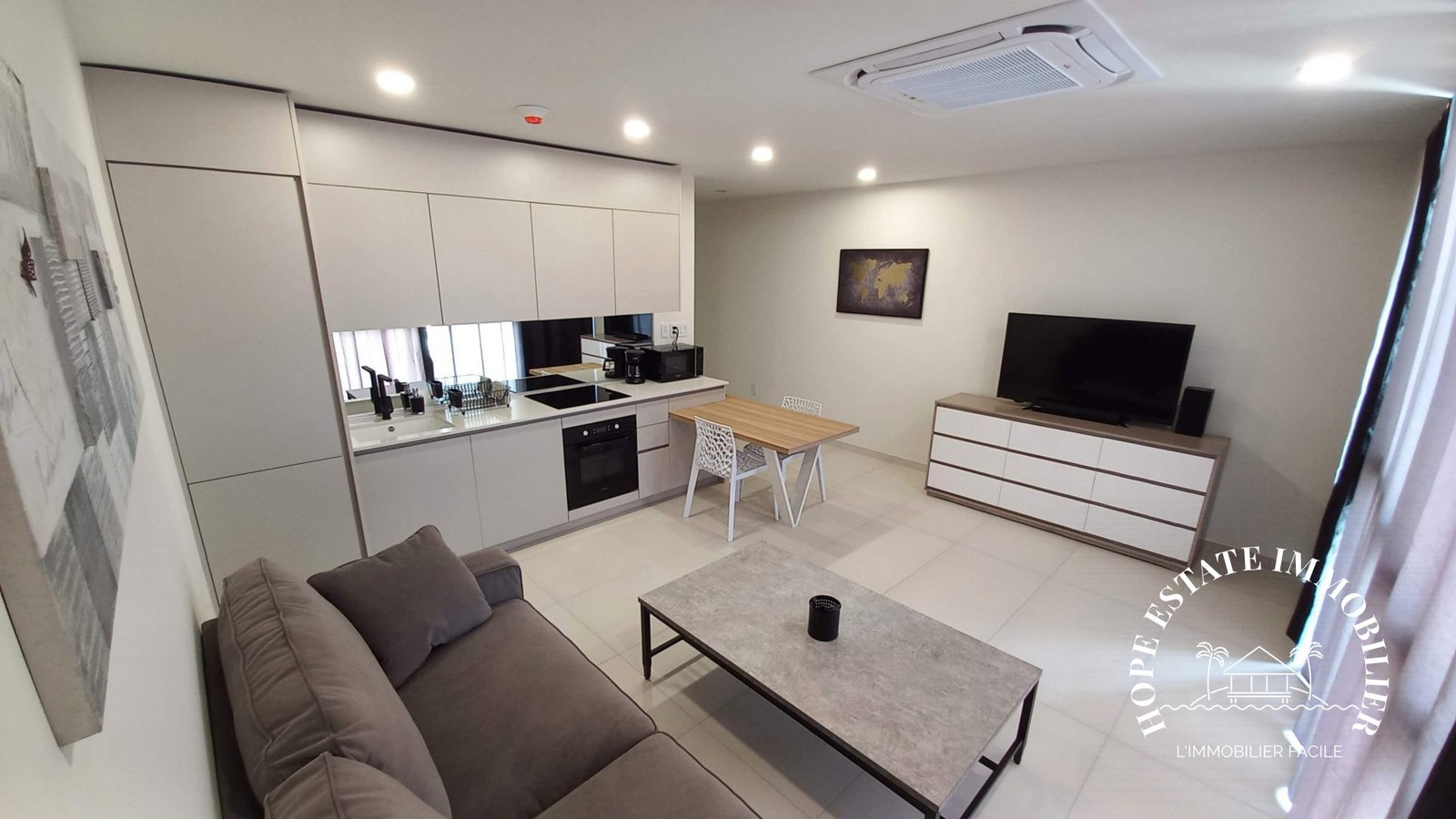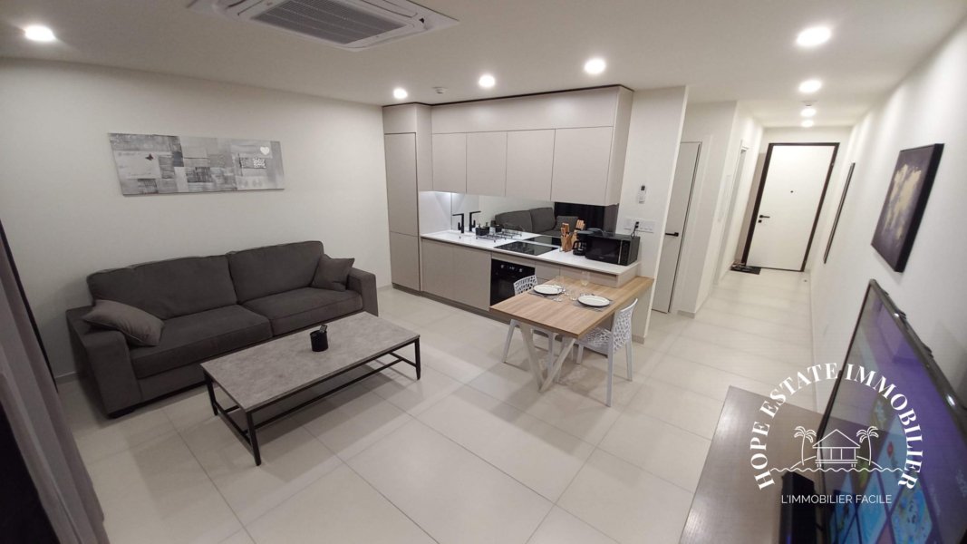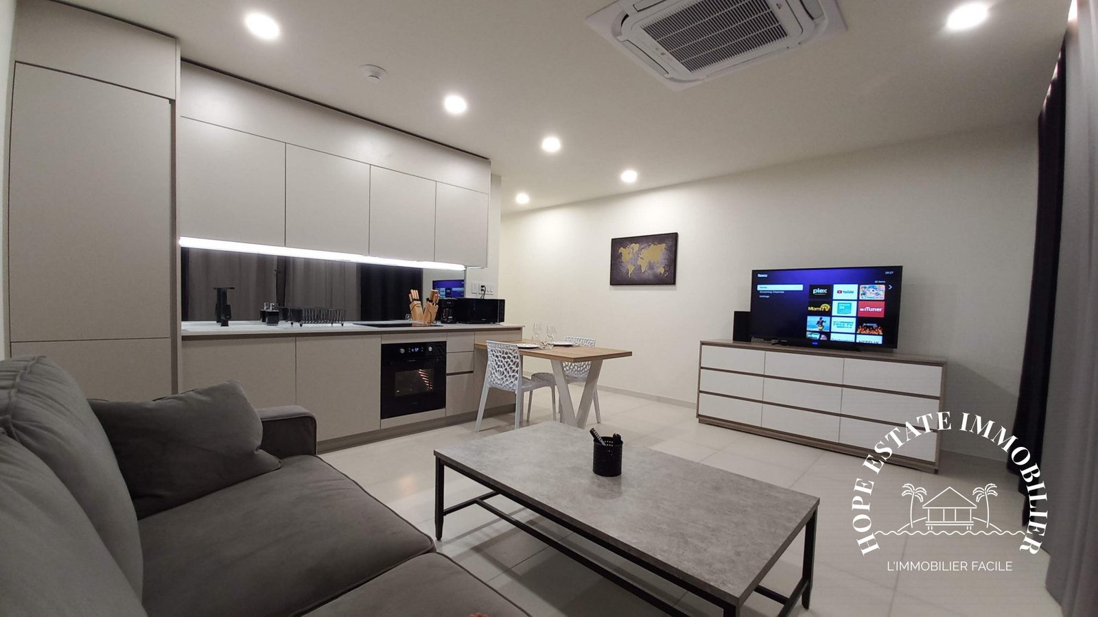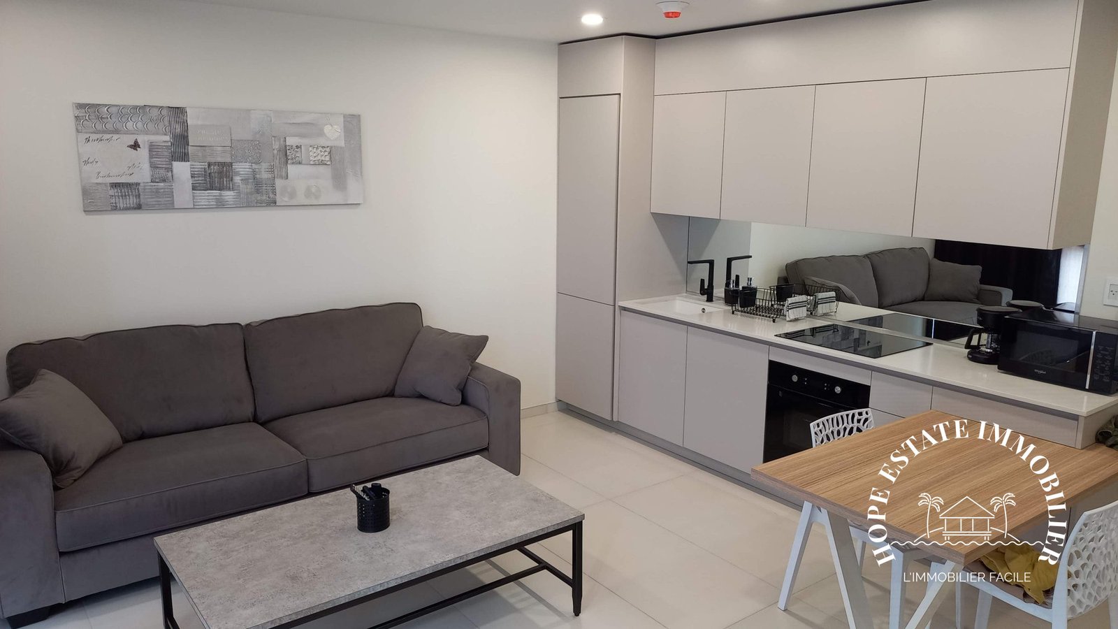 Salon lumineux de 21,50 m² avec une cuisine moderne ouverte, entièrement équipée et aménagée, ainsi qu’un espace dînatoire.