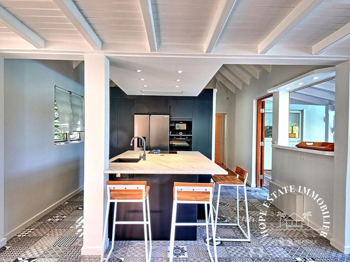 Confort et convivialité : Une cuisine moderne avec îlot central, ouverte sur un séjour traversant baigné de lumière naturelle.