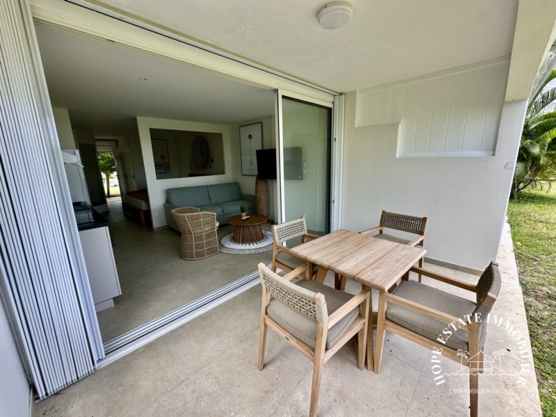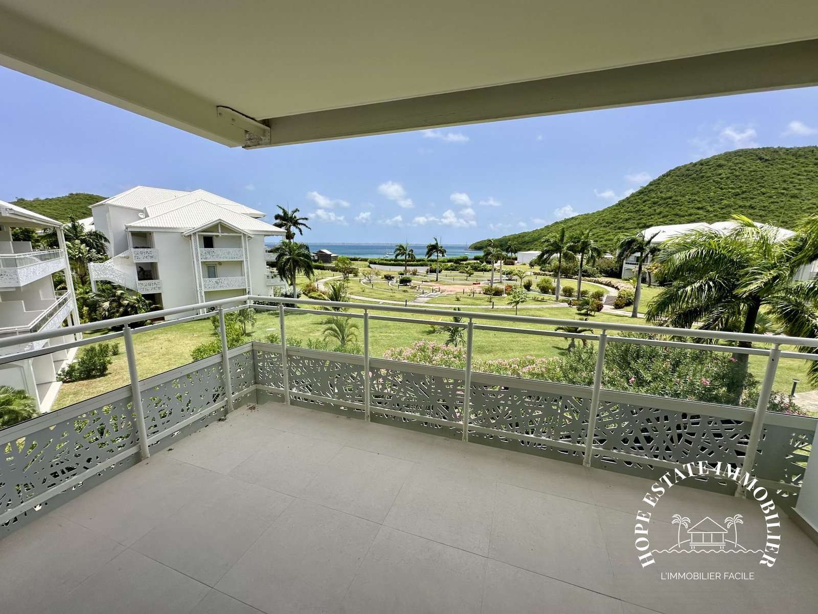 Une agréable terrasse couverte de 10,29 m², idéale pour profiter de la vue sur les jardins tropicaux – et sur la mer pour les appartements à l’étage.